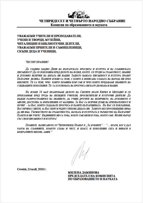 Писмо от проф. Ваня Добрева - Председател на Комисията по образование и наука към 42 Народно събрание, по повод 5 октомври - Международен ден на учителя.