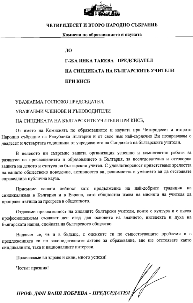 ПОЗДРАВИТЕЛЕН АДРЕС ДО ЧЛЕНОВЕТЕ НА СИНДИКАТА НА БЪЛГАРСКИТЕ УЧИТЕЛИ ОТ ПРОФ.ДФН ВАНЯ ДОБРЕВА, ПРЕДСЕДАТЕЛ НА КОМИСИЯТА ПО ОБРАЗОВАНИЕТО И НАУКАТА ПРИ 42 НС ПО ПОВОД 24 ГОДИНИ ОТ УЧРЕДЯВАНЕТО НА СБУ