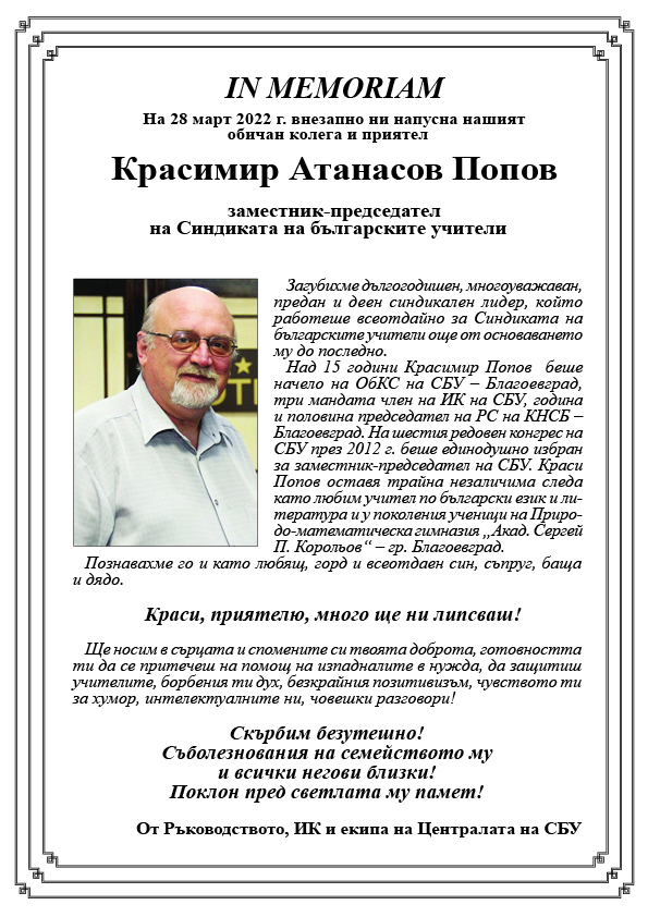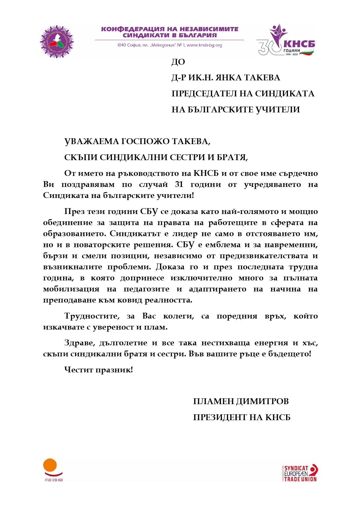 ПОЗДРАВИТЕЛЕН АДРЕС ДО ЧЛЕНОВЕТЕ НА СИНДИКАТА НА БЪЛГАРСКИТЕ УЧИТЕЛИ ОТ Г-Н ПЛАМЕН ДИМИТРОВ - ПРЕЗИДЕНТ НА КНСБ ПО ПОВОД 24 ГОДИНИ ОТ УЧРЕДЯВАНЕТО НА СБУ
