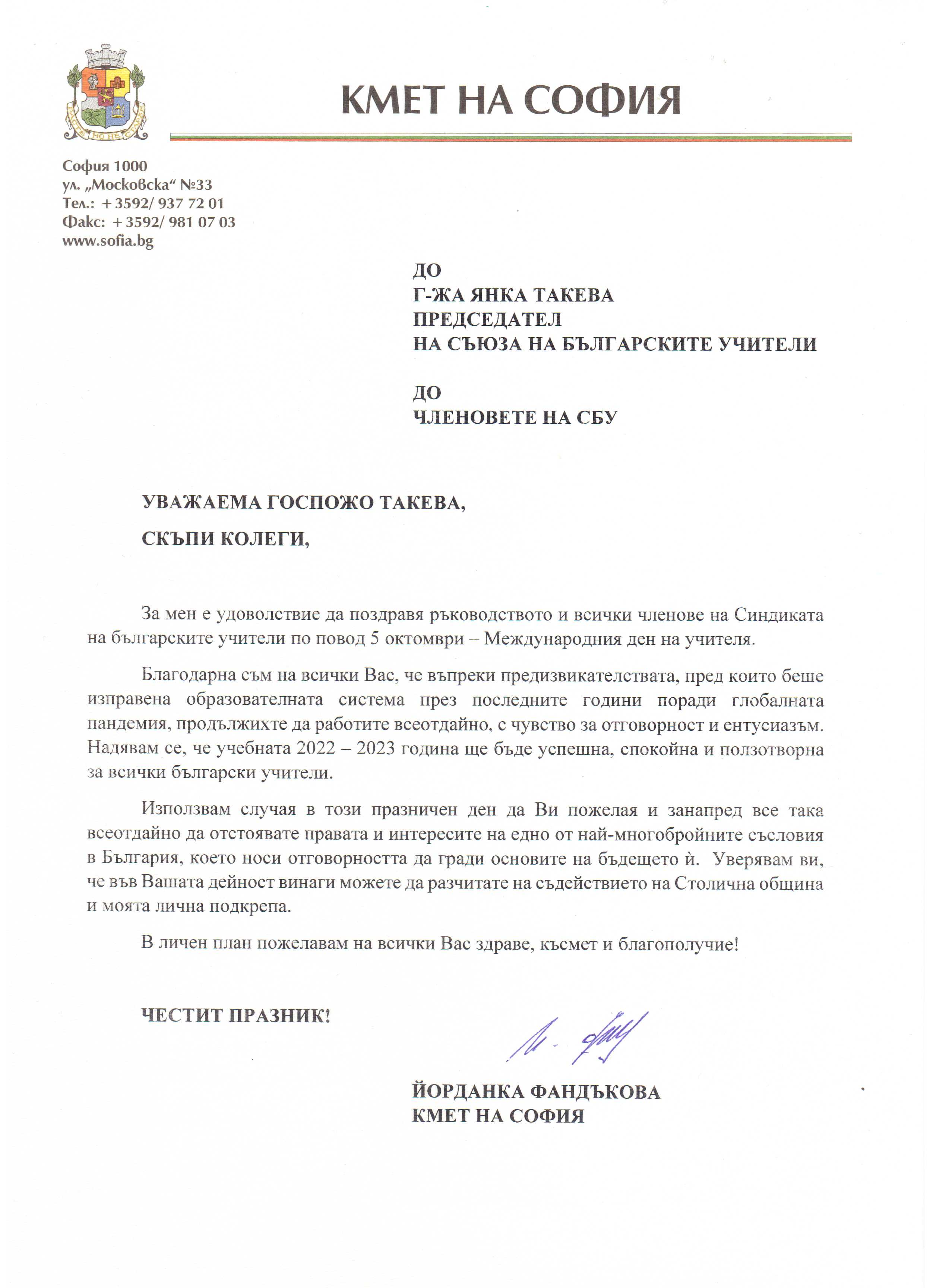 Поздравителен адрес от г-жа Йорданка Фандъкова, кмет на София, по повод 5 Октомври - Международен ден на учителя